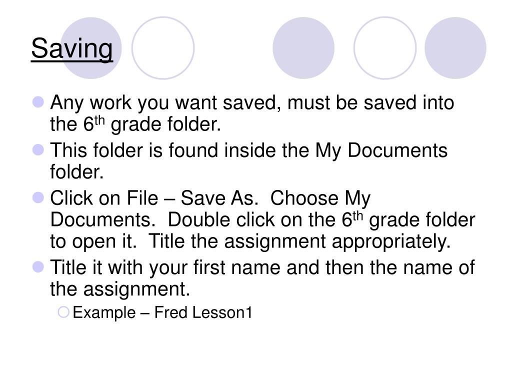 Saving • Any work you want saved, must be saved into the 6th grade folder. • This folder is found inside the My Documents folder. • Click on File – Save As. Choose My Documents. Double click on the 6th grade folder to open it. Title the assignment appropriately. • Title it with your first name and then the name of the assignment. • Example – Fred Lesson1