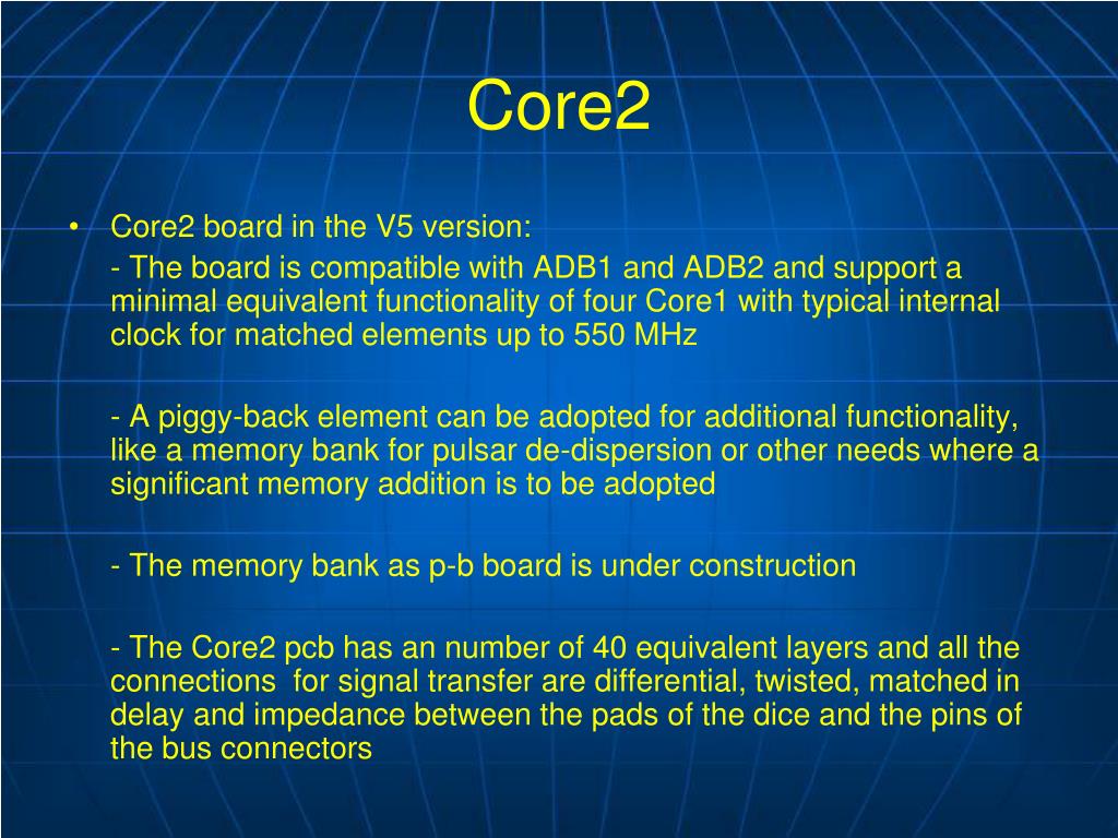Core2 • Core2 board in the V5 version: - The board is compatible with ADB1 and ADB2 and support a minimal equivalent functionality of four Core1 with typical internal clock for matched elements up to 550 MHz - A piggy-back element can be adopted for additional functionality, like a memory bank for pulsar de-dispersion or other needs where a significant memory addition is to be adopted - The memory bank as p-b board is under construction - The Core2 pcb has an number of 40 equivalent layers and all the connections for signal transfer are differential, twisted, matched in delay and impedance between the pads of the dice and the pins of the bus connectors