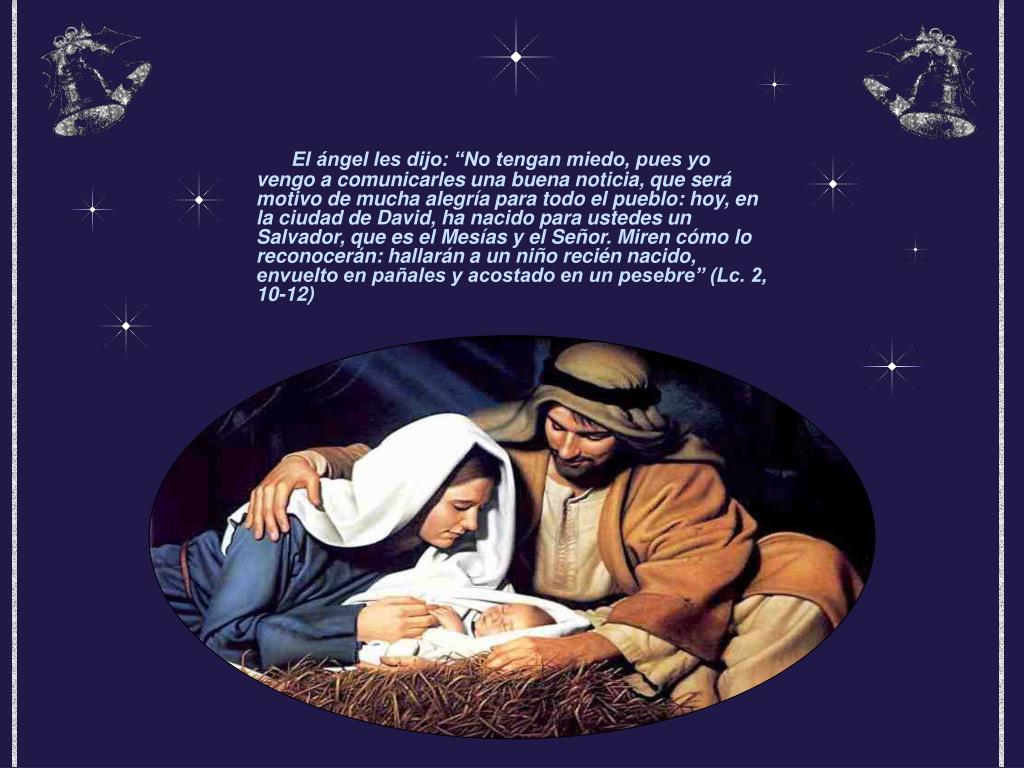 El ángel les dijo: “No tengan miedo, pues yo vengo a comunicarles una buena noticia, que será motivo de mucha alegría para todo el pueblo: hoy, en la ciudad de David, ha nacido para ustedes un Salvador, que es el Mesías y el Señor. Miren cómo lo reconocerán: hallarán a un niño recién nacido, envuelto en pañales y acostado en un pesebre” (Lc. 2, 10-12)