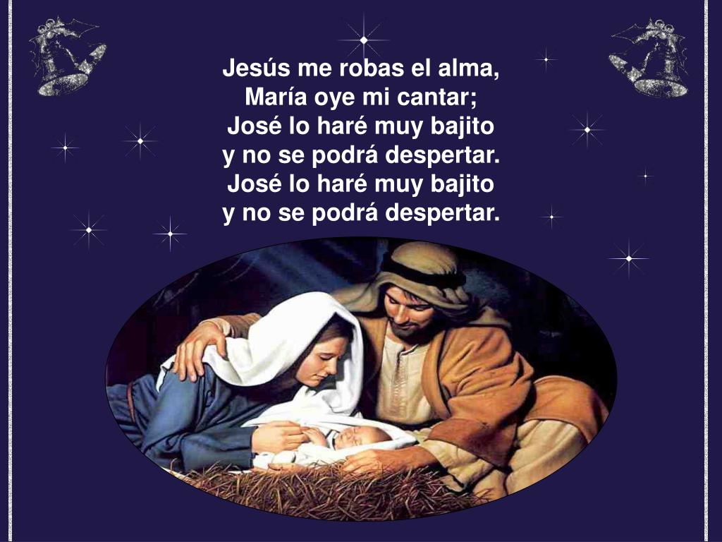 Jesús me robas el alma, María oye mi cantar; José lo haré muy bajito y no se podrá despertar. José lo haré muy bajito y no se podrá despertar.