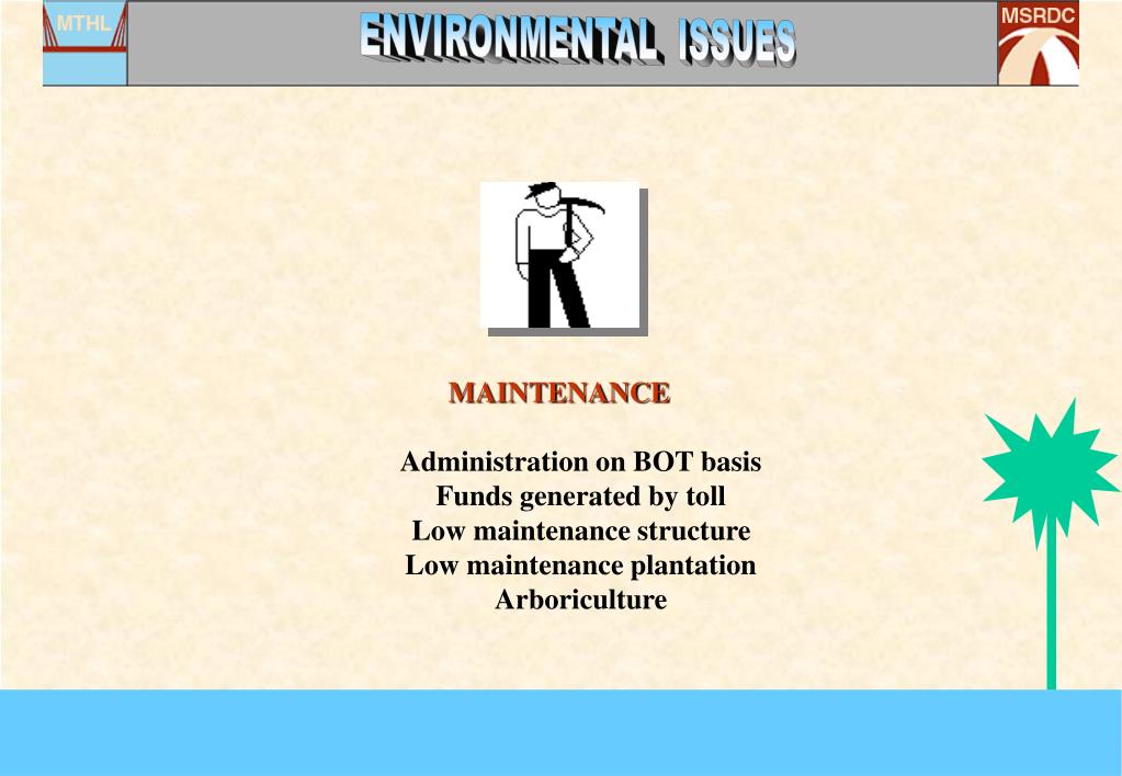 ENVIRONMENTAL ISSUES MAINTENANCE Administration on BOT basis Funds generated by toll Low maintenance structure Low maintenance plantation Arboriculture