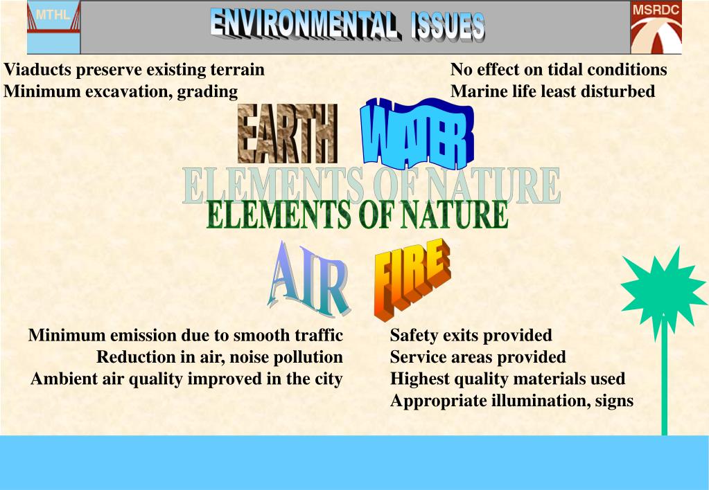 ENVIRONMENTAL ISSUES Viaducts preserve existing terrain Minimum excavation, grading No effect on tidal conditions Marine life least disturbed EARTH WATER ELEMENTS OF NATURE AIR FIRE Minimum emission due to smooth traffic Reduction in air, noise pollution Ambient air quality improved in the city Safety exits provided Service areas provided Highest quality materials used Appropriate illumination, signs