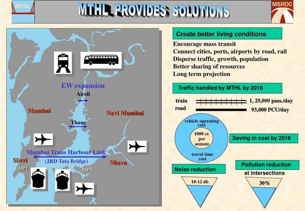 vehicle operating cost 1000 cr. per annum travel time cost 30% MTHL PROVIDES SOLUTIONS Create better living conditions Encourage mass transit Connect cities, ports, airports by road, rail Disperse traffic, growth, population Better sharing of resources Long term projection EW expansion Traffic handled by MTHL by 2016 Airoli train 1, 25,000 pass./day road 93,000 PCU/day Mumbai Navi Mumbai Thane Saving in cost by 2016 Mumbai Trans Harbour Link Siwri (JRD Tata Bridge) Nhava Pollution reduction at intersections MPT Noise reduction JNPT 10-12 db