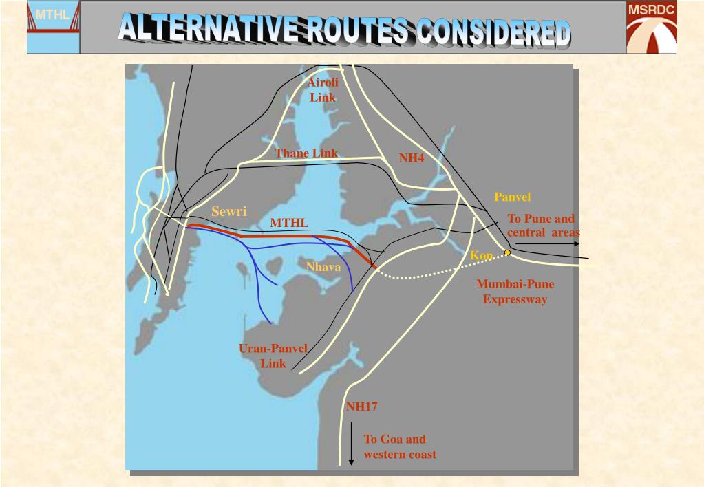 ALTERNATIVE ROUTES CONSIDERED Airoli Link Thane Link NH4 Panvel Sewri To Pune and central areas MTHL Kon Nhava Mumbai-Pune Expressway Uran-Panvel Link NH17 To Goa and western coast