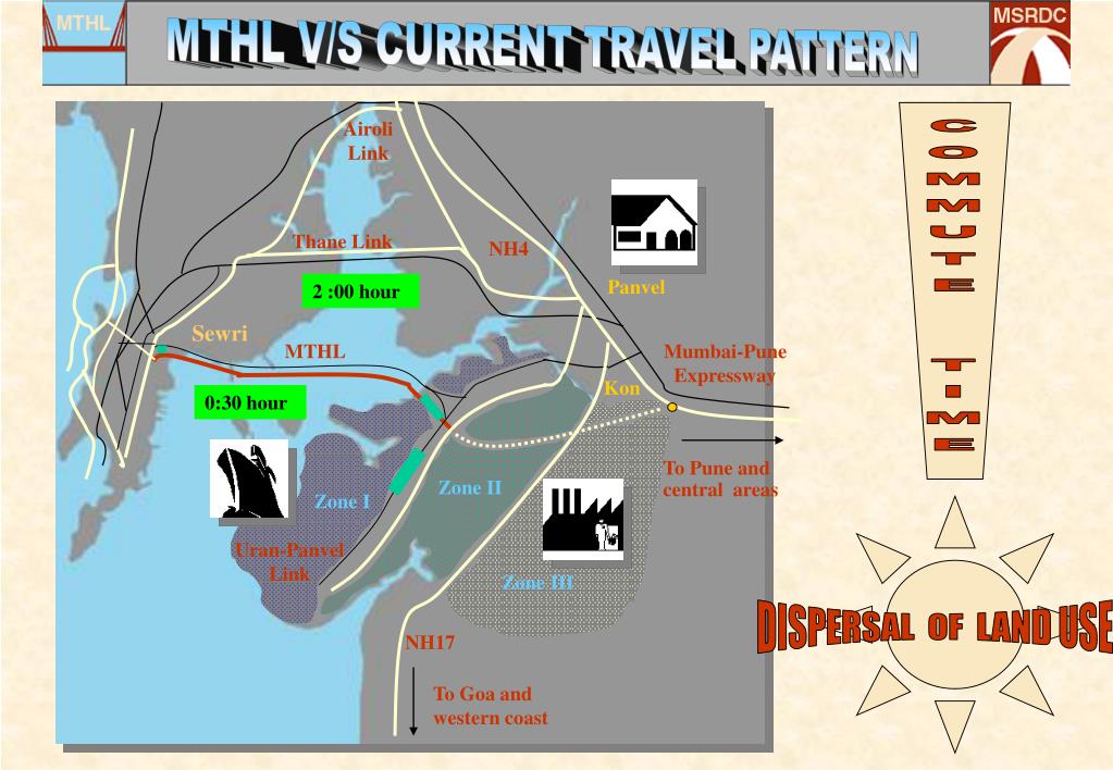 COMMUTE TIME DISPERSAL OF LAND USE MTHL V/S CURRENT TRAVEL PATTERN Airoli Link Thane Link NH4 Panvel 2 :00 hour Sewri MTHL Mumbai-Pune Expressway Kon 0:30 hour JNPT NH4B To Pune and central areas Zone II Zone I Uran-Panvel Link Zone III NH17 To Goa and western coast