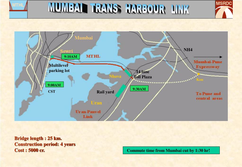 MUMBAI TRANS HARBOUR LINK Mumbai NH4 9:10AM Multilevel parking lot 14 lane Toll Plaza Nhava Kon 9:00AM 9:30AM CST Rail yard Uran Bridge length : 25 km. Construction period: 4 years Cost : 5000 cr. Commute time from Mumbai cut by 1:30 hr!