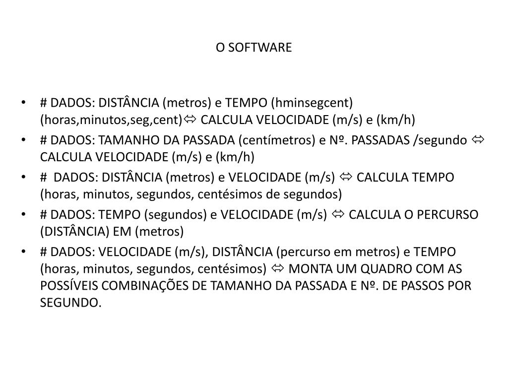 O SOFTWARE • # DADOS: DISTÂNCIA (metros) e TEMPO (hminsegcent) (horas,minutos,seg,cent) CALCULA VELOCIDADE (m/s) e (km/h) • # DADOS: TAMANHO DA PASSADA (centímetros) e Nº. PASSADAS /segundo CALCULA VELOCIDADE (m/s) e (km/h) • # DADOS: DISTÂNCIA (metros) e VELOCIDADE (m/s) CALCULA TEMPO (horas, minutos, segundos, centésimos de segundos) • # DADOS: TEMPO (segundos) e VELOCIDADE (m/s) CALCULA O PERCURSO (DISTÂNCIA) EM (metros) • # DADOS: VELOCIDADE (m/s), DISTÂNCIA (percurso em metros) e TEMPO (horas, minutos, segundos, centésimos) MONTA UM QUADRO COM AS POSSÍVEIS COMBINAÇÕES DE TAMANHO DA PASSADA E Nº. DE PASSOS POR SEGUNDO.