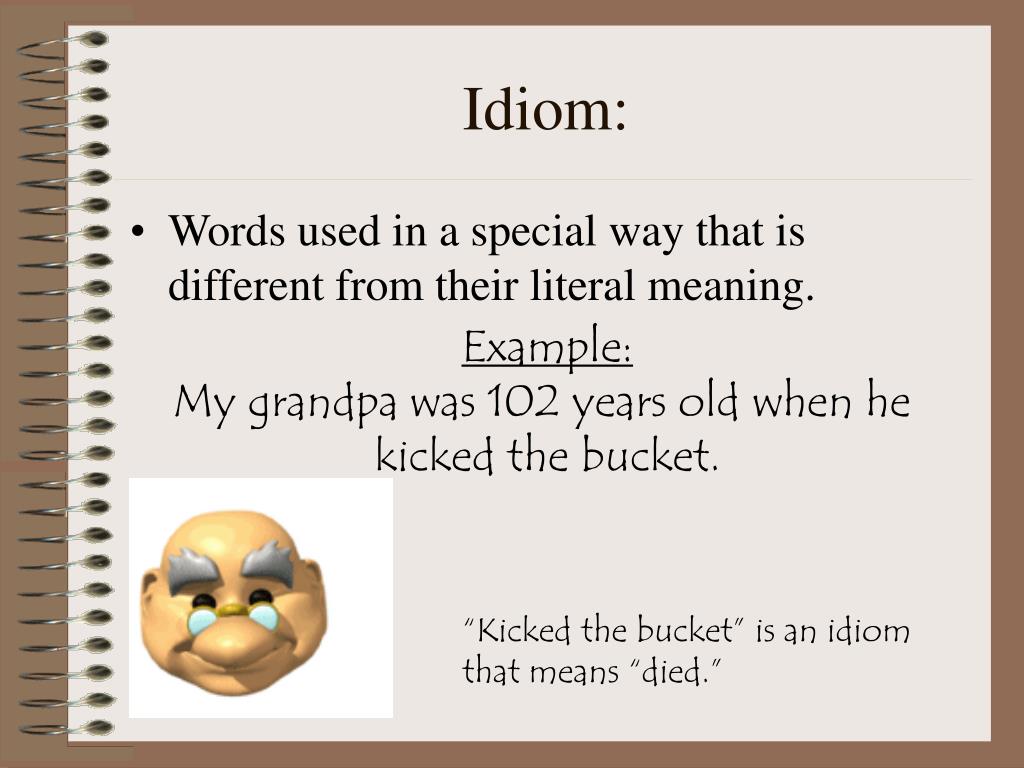 Idiom: • Words used in a special way that is different from their literal meaning. Example: My grandpa was 102 years old when he kicked the bucket. “Kicked the bucket” is an idiom that means “died.”