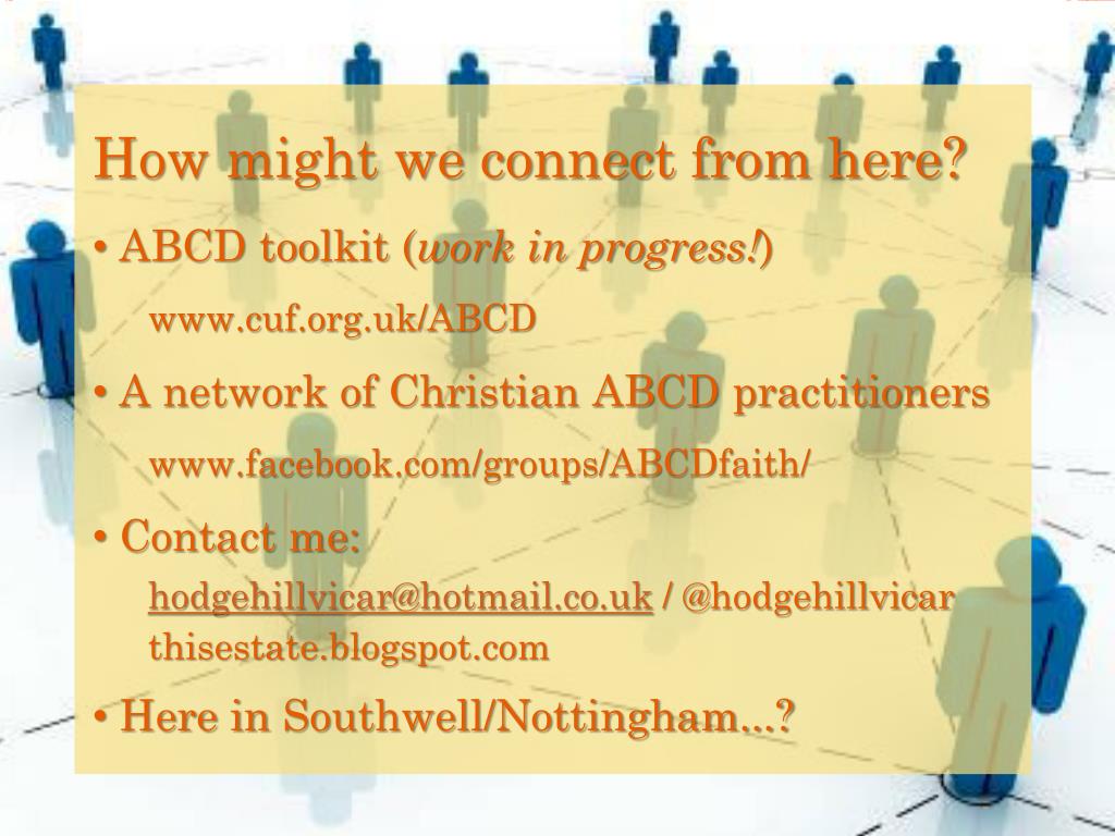 How might we connect from here? • ABCD toolkit (work in progress!) • www.cuf.org.uk/ABCD • A network of Christian ABCD practitioners • www.facebook.com/groups/ABCDfaith/ • Contact me: • hodgehillvicar@hotmail.co.uk / @hodgehillvicar • thisestate.blogspot.com • Here in Southwell/Nottingham...?