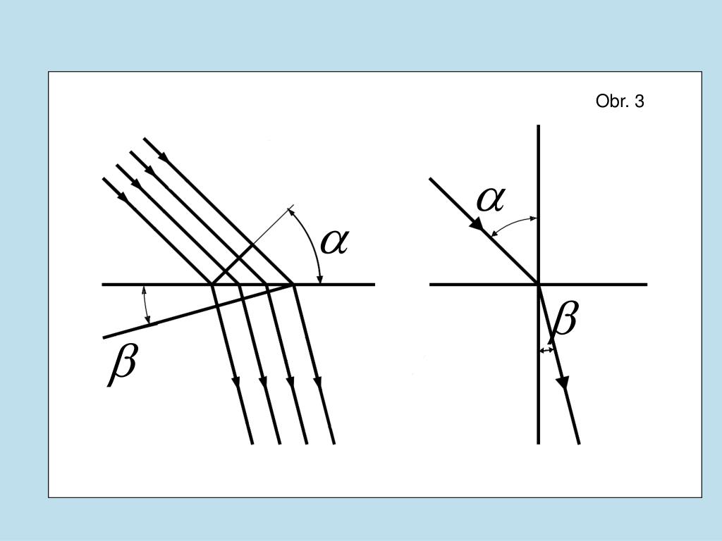 Lom světla při přechodu z prostředí opticky řidšího do prostředí opticky hustšího – lom ke kolmici Obr. 4 odraz lom