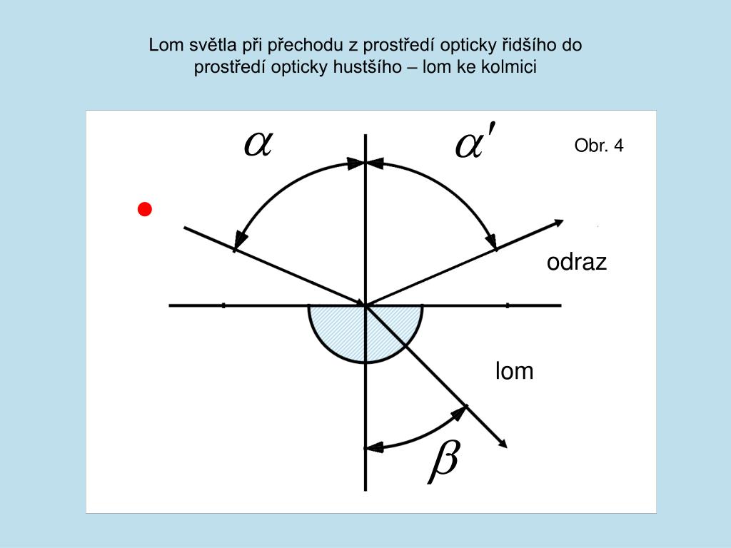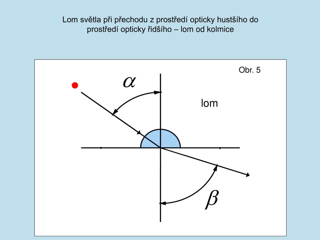 Lom světla při přechodu z prostředí opticky hustšího do prostředí opticky řidšího – lom od kolmice Obr. 5 lom