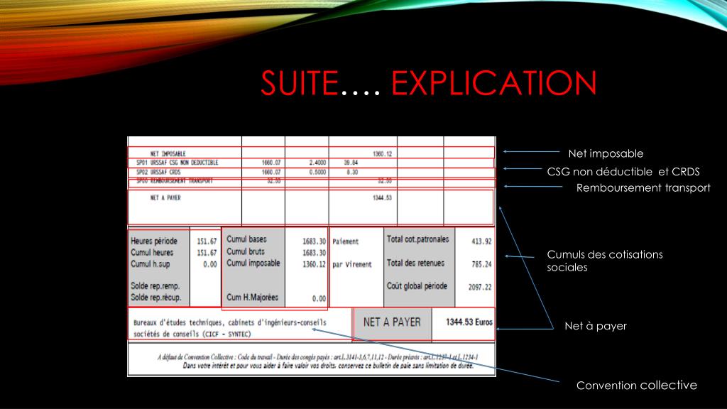 Suite…. Explication Net imposable CSG non déductible et CRDS Remboursementtransport Cumuls des cotisations sociales Net à payer Convention collective