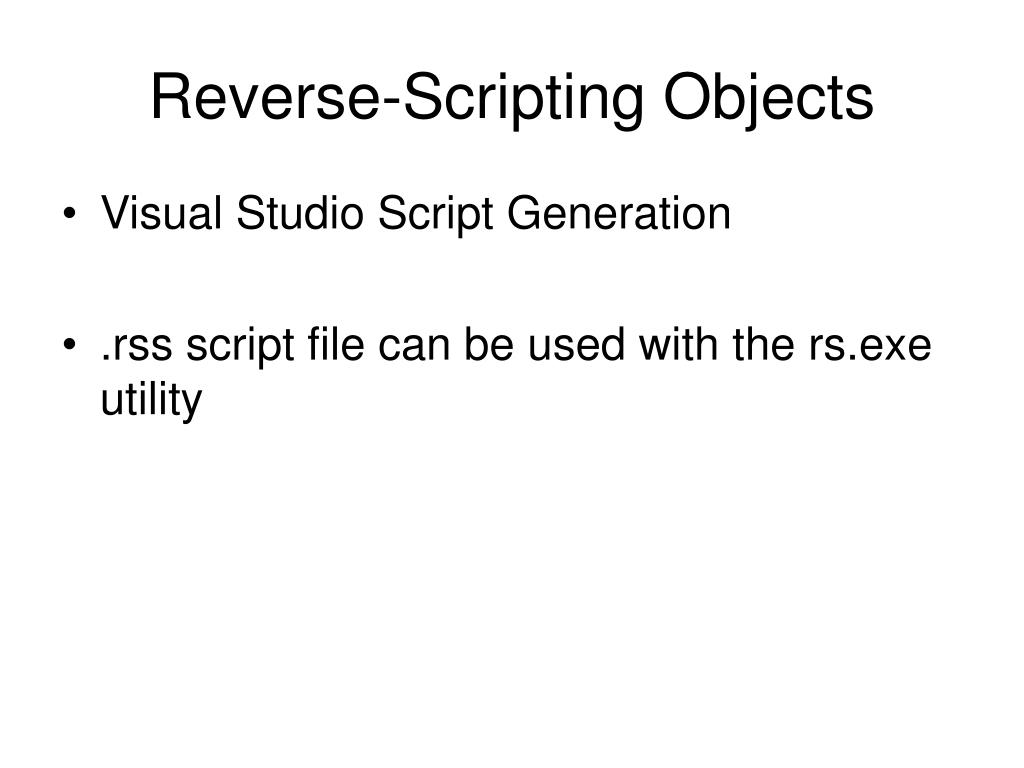Reverse-Scripting Objects • Visual Studio Script Generation • .rss script file can be used with the rs.exe utility