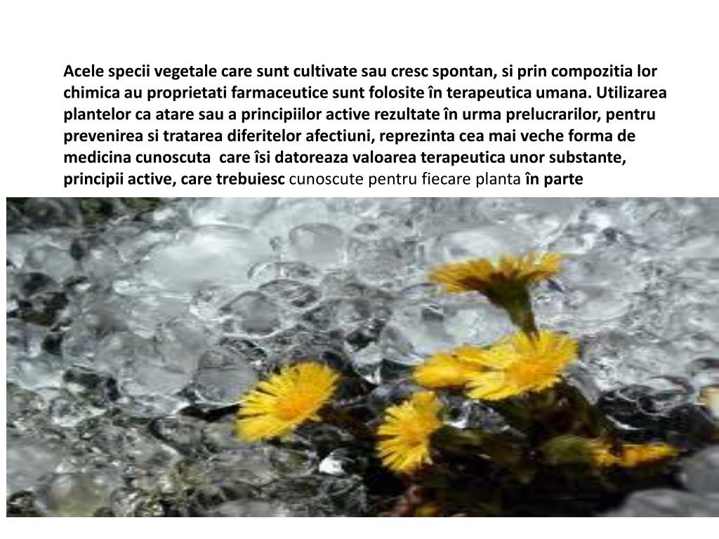 Acelespeciivegetale care sunt cultivate saucrescspontan, siprincompozitialorchimica au proprietatifarmaceuticesuntfolositeînterapeuticaumana. Utilizareaplantelor ca ataresau a principiilor active rezultateînurmaprelucrarilor, pentruprevenireasitratareadiferitelorafectiuni, reprezintaceamaiveche forma de medicinacunoscuta care îsidatoreazavaloareaterapeuticaunorsubstante, principii active, care trebuiesccunoscutepentrufiecareplantaîn parte