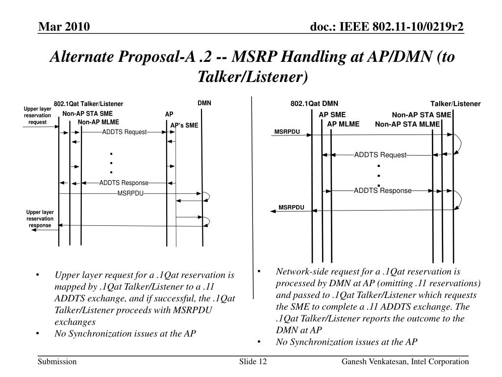 Alternate Proposal-A .2 -- MSRP Handling at AP/DMN (to Talker/Listener) • Network-side request for a .1Qat reservation is processed by DMN at AP (omitting .11 reservations) and passed to .1Qat Talker/Listener which requests the SME to complete a .11 ADDTS exchange. The .1Qat Talker/Listener reports the outcome to the DMN at AP • No Synchronization issues at the AP • Upper layer request for a .1Qat reservation is mapped by .1Qat Talker/Listener to a .11 ADDTS exchange, and if successful, the .1Qat Talker/Listener proceeds with MSRPDU exchanges • No Synchronization issues at the AP Ganesh Venkatesan, Intel Corporation