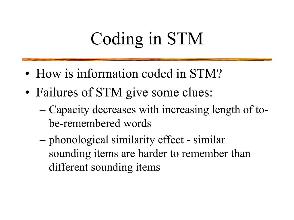 Coding in STM • How is information coded in STM? • Failures of STM give some clues: • Capacity decreases with increasing length of to-be-remembered words