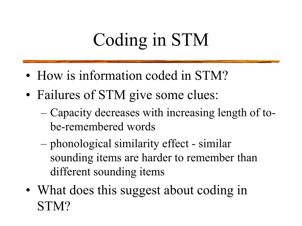 Coding in STM • How is information coded in STM? • Failures of STM give some clues: • Capacity decreases with increasing length of to-be-remembered words • phonological similarity effect - similar sounding items are harder to remember than different sounding items • What does this suggest about coding in STM?