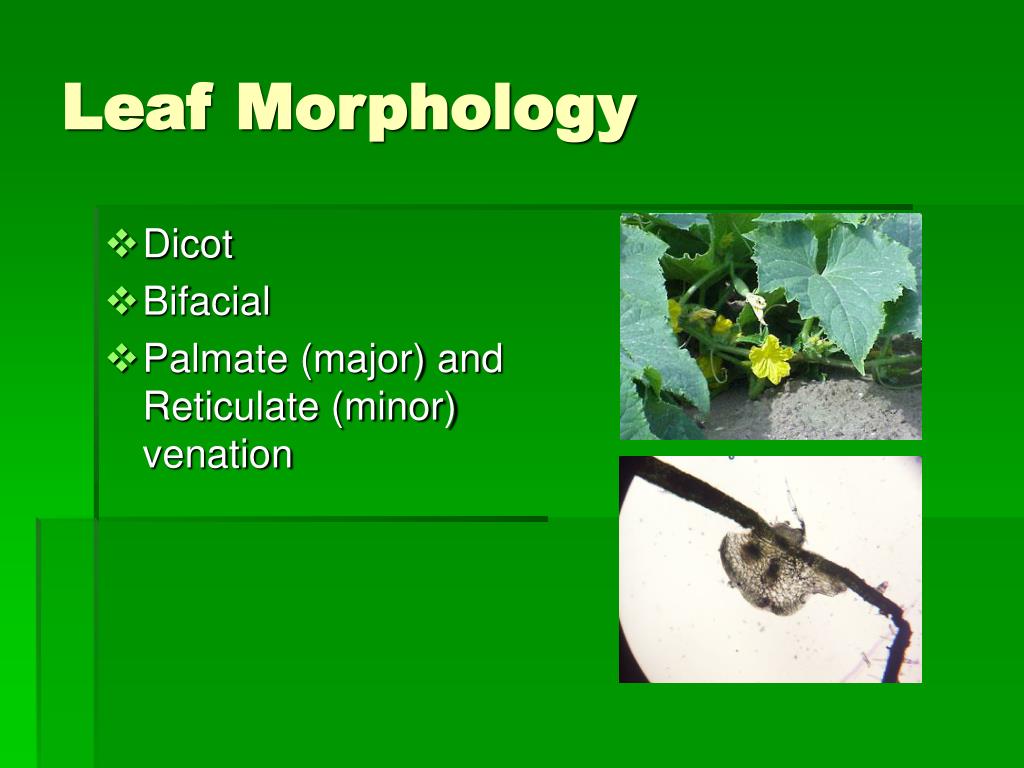 Leaf Morphology • Dicot • Bifacial • Palmate (major) and Reticulate (minor) venation