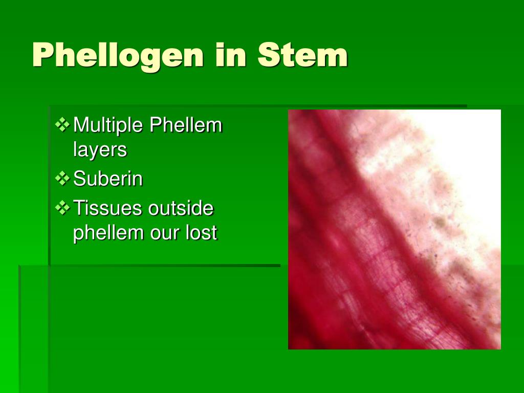 Phellogen in Stem • Multiple Phellem layers • Suberin • Tissues outside phellem our lost