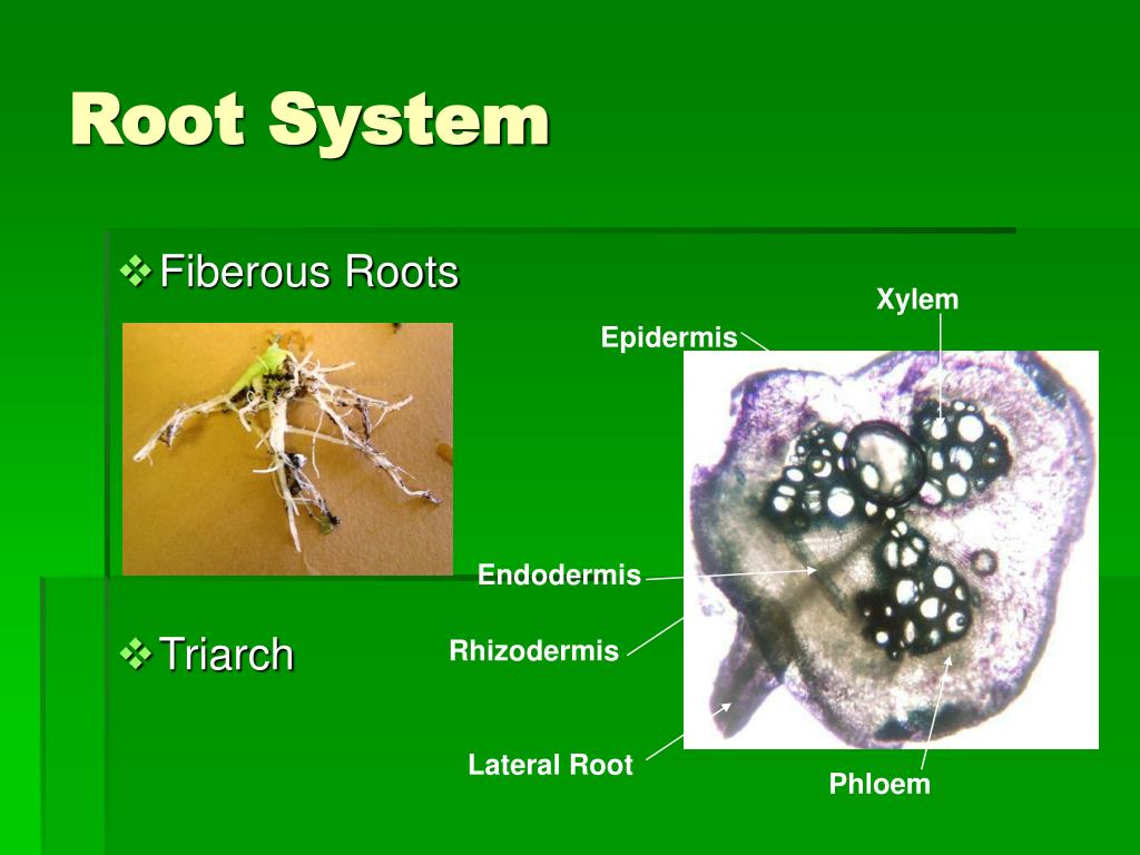 Root System • Fiberous Roots • Triarch Xylem Epidermis Endodermis Rhizodermis Lateral Root Phloem