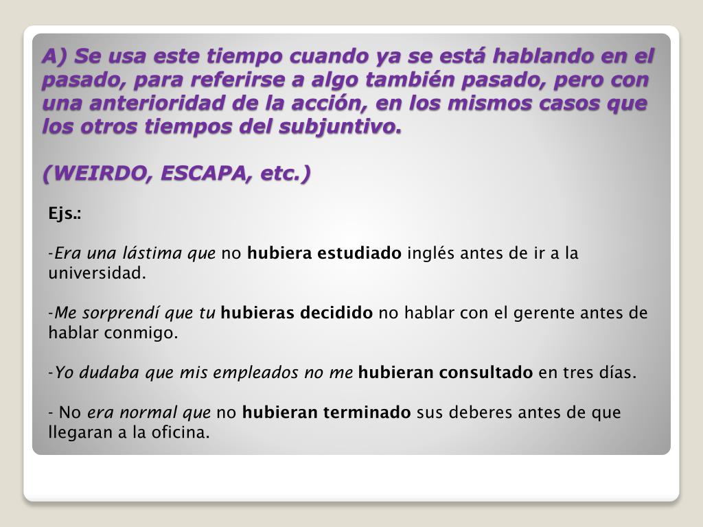 Ejs.: • Era una lástima que no hubiera estudiado inglés antes de ir a la universidad. • Me sorprendí que tu hubieras decidido no hablar con el gerente antes de hablar conmigo. • Yo dudaba que mis empleados nome hubieran consultado en tres días. • - No era normal que no hubieran terminado sus deberes antes de que llegaran a la oficina. A) Se usa este tiempo cuando ya se está hablando en el pasado, para referirse a algo también pasado, pero con una anterioridad de la acción, en los mismos casos que los otros tiempos del subjuntivo. (WEIRDO, ESCAPA, etc.)