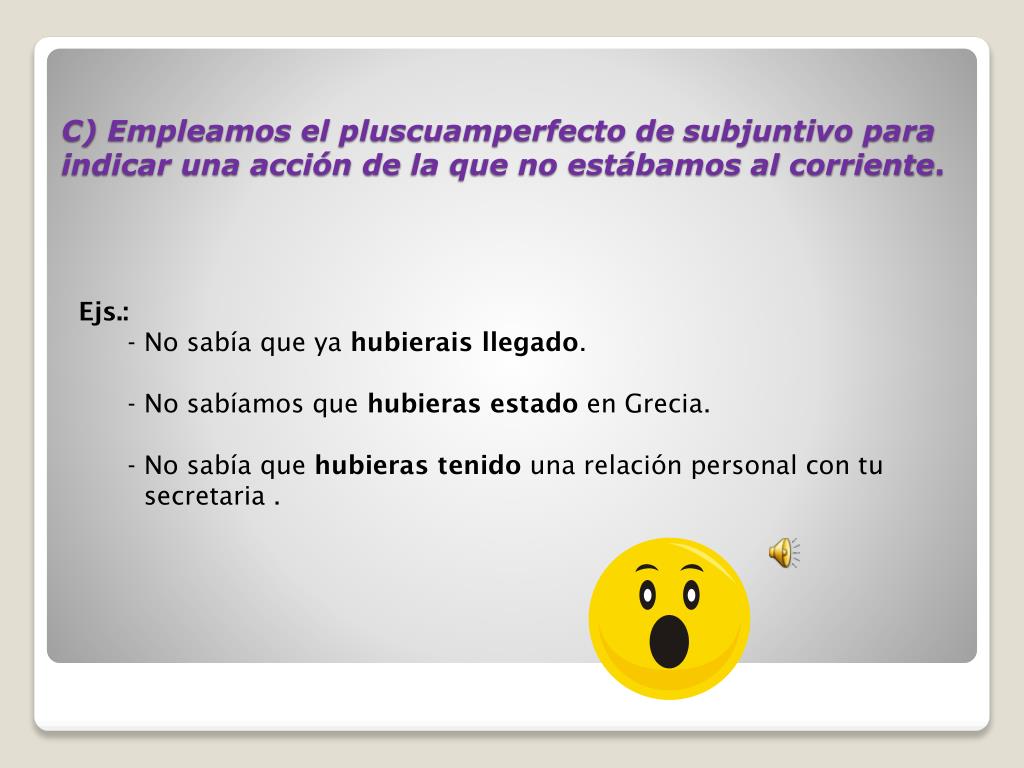 Ejs.:- No sabía que ya hubierais llegado. - No sabíamos que hubieras estado en Grecia. - No sabía que hubieras tenidouna relación personal con tu secretaria . C) Empleamos el pluscuamperfecto de subjuntivo para indicar una acción de la que no estábamos al corriente.