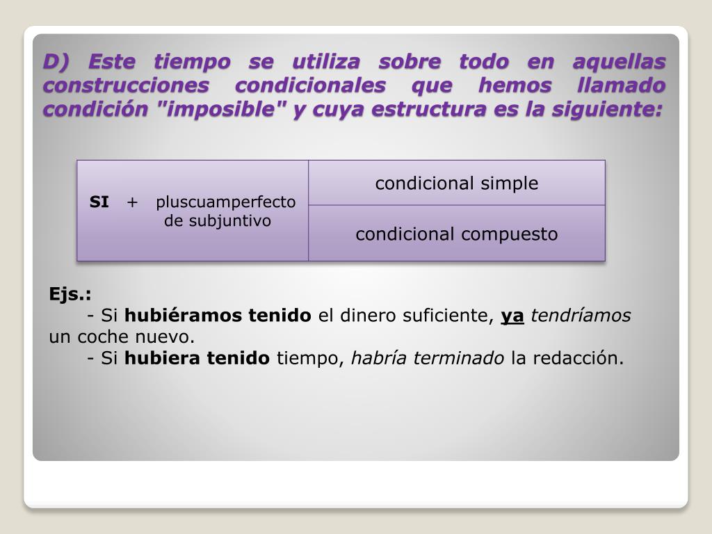 Ejs.:- Sihubiéramos tenido el dinero suficiente, yatendríamos un coche nuevo.- Sihubiera tenido tiempo, habría terminado la redacción. D) Este tiempo se utiliza sobre todo en aquellas construcciones condicionales que hemos llamado condición "imposible" y cuya estructura es la siguiente: