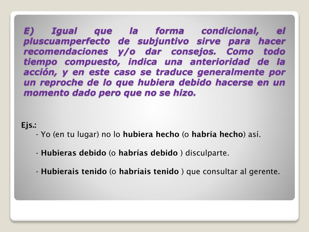 Ejs.:- Yo (en tu lugar) no lo hubiera hecho (o habría hecho) así. - Hubieras debido (o habrías debido ) disculparte. - Hubierais tenido (o habríais tenido ) que consultar al gerente. E) Igual que la forma condicional, el pluscuamperfecto de subjuntivo sirve para hacer recomendaciones y/o dar consejos. Como todo tiempo compuesto, indica una anterioridad de la acción, y en este caso se traduce generalmente por un reproche de lo que hubiera debido hacerse en un momento dado pero que no se hizo.