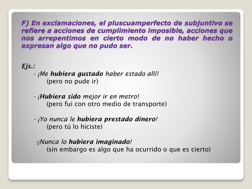 Ejs.:- ¡Me hubiera gustado haber estado allí! (pero no pude ir) - ¡Hubiera sido mejor ir en metro! (pero fui con otro medio de transporte) - ¡Yo nunca le hubiera prestado dinero! (pero tú lo hiciste) -¡Nunca lo hubiera imaginado! (sin embargo es algo que ha ocurrido o que es cierto) F) En exclamaciones, el pluscuamperfecto de subjuntivo se refiere a acciones de cumplimiento imposible, acciones que nos arrepentimos en cierto modo de no haber hecho o expresan algo que no pudo ser.