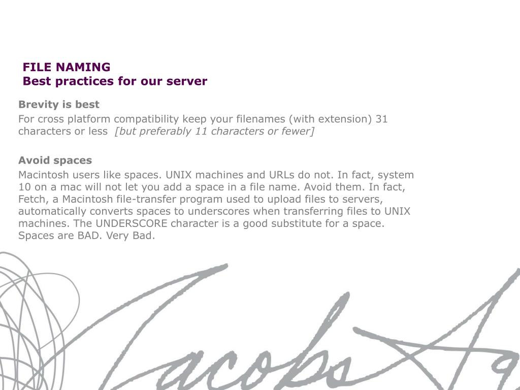 FILE NAMING Best practices for our server • Brevity is best • For cross platform compatibility keep your filenames (with extension) 31 characters or less [but preferably 11 characters or fewer] • Avoid spaces • Macintosh users like spaces. UNIX machines and URLs do not. In fact, system 10 on a mac will not let you add a space in a file name. Avoid them. In fact, Fetch, a Macintosh file-transfer program used to upload files to servers, automatically converts spaces to underscores when transferring files to UNIX machines. The UNDERSCORE character is a good substitute for a space. Spaces are BAD. Very Bad.