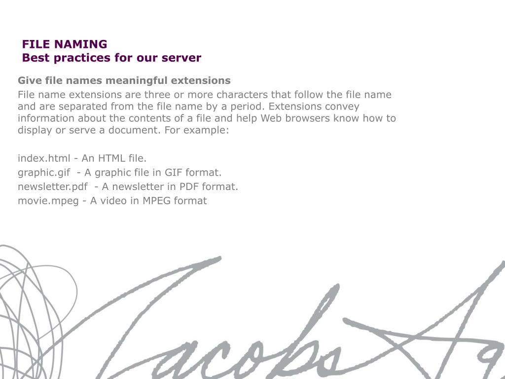 FILE NAMING Best practices for our server • Give file names meaningful extensions • File name extensions are three or more characters that follow the file name and are separated from the file name by a period. Extensions convey information about the contents of a file and help Web browsers know how to display or serve a document. For example: • index.html - An HTML file. • graphic.gif - A graphic file in GIF format. • newsletter.pdf - A newsletter in PDF format. • movie.mpeg - A video in MPEG format