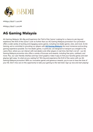 ##https://bbd11.com/## ##https://bbd11.com/## AG Gaming Malaysia AG Gaming Malaysia: Win Big and Experience the Thrill of the Casino! Looking for a chance to win big and experience the thrill of the casino? Look no further than our AG Gaming Malaysia promotion! Our promotion offers a wide variety of exciting and engaging casino games, including live dealer games, slots, and more. At AG Gaming, we're committed to providing our players with AG Gaming Malaysia the most immersive and exciting gaming experience possible. Our live dealer games, in particular, are designed to transport you straight to the casino floor, where you can interact with real dealers and other players in real-time. But that's not all – our AG Gaming Malaysia promotion also offers a variety of bonuses and rewards, including free spins, cashback, and more. Plus, our user-friendly interface and top-notch graphics make it easy to find your favorite games and start playing right away. So what are you waiting for? Win big and experience the thrill of the casino with our AG Gaming Malaysia promotion! With our innovative games and generous rewards, you're sure to have the time of your life. Don't miss out on this opportunity to take your gaming to the next level. Sign up now and start playing!