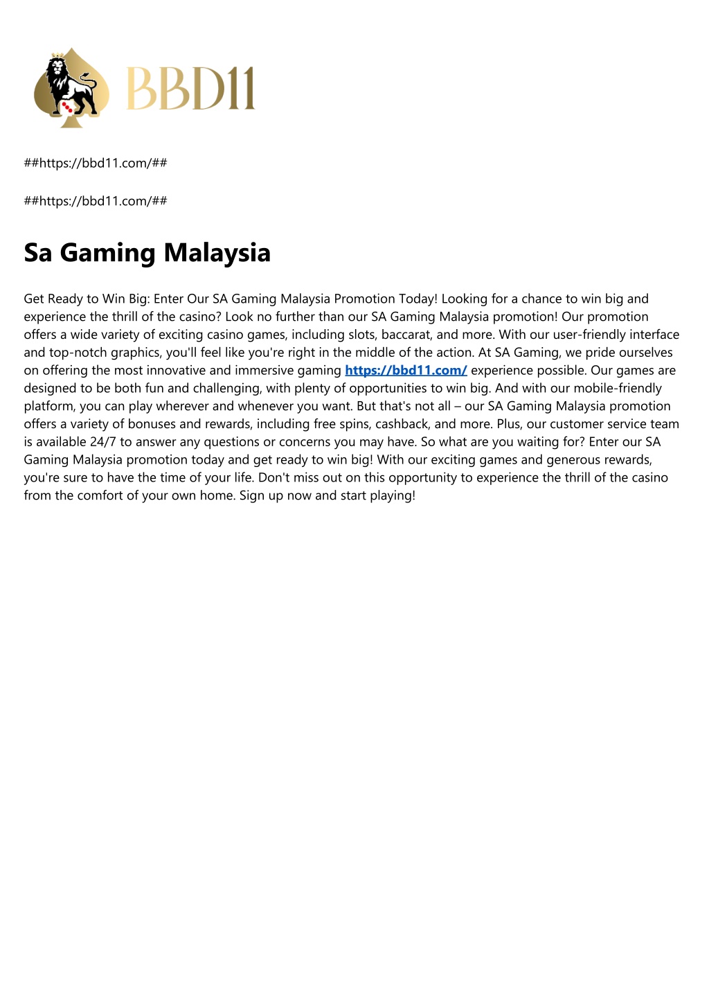 ##https://bbd11.com/## ##https://bbd11.com/## Sa Gaming Malaysia Get Ready to Win Big: Enter Our SA Gaming Malaysia Promotion Today! Looking for a chance to win big and experience the thrill of the casino? Look no further than our SA Gaming Malaysia promotion! Our promotion offers a wide variety of exciting casino games, including slots, baccarat, and more. With our user-friendly interface and top-notch graphics, you'll feel like you're right in the middle of the action. At SA Gaming, we pride ourselves on offering the most innovative and immersive gaming https://bbd11.com/ experience possible. Our games are designed to be both fun and challenging, with plenty of opportunities to win big. And with our mobile-friendly platform, you can play wherever and whenever you want. But that's not all – our SA Gaming Malaysia promotion offers a variety of bonuses and rewards, including free spins, cashback, and more. Plus, our customer service team is available 24/7 to answer any questions or concerns you may have. So what are you waiting for? Enter our SA Gaming Malaysia promotion today and get ready to win big! With our exciting games and generous rewards, you're sure to have the time of your life. Don't miss out on this opportunity to experience the thrill of the casino from the comfort of your own home. Sign up now and start playing!