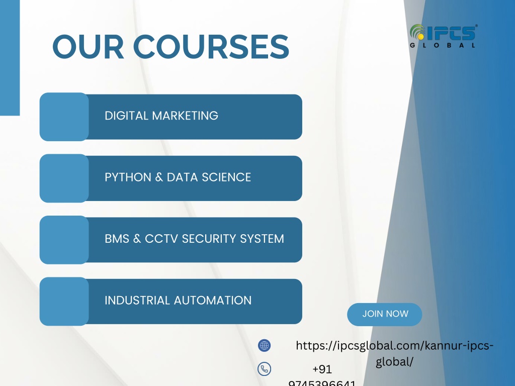 3. https://ipcsglobal.com/kannur-ipcs-global/ JOIN NOW +91 9745396641 OUR COURSES DIGITAL MARKETING PYTHON & DATA SCIENCE BMS & CCTV SECURITY SYSTEM INDUSTRIAL AUTOMATION