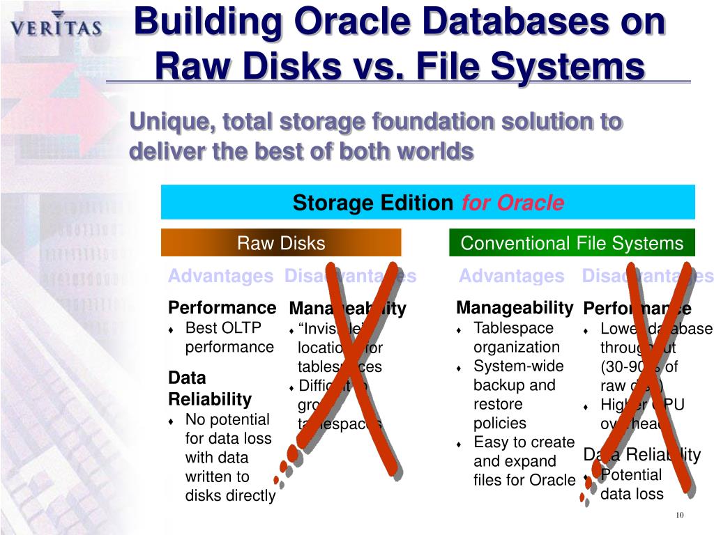 Building Oracle Databases onRaw Disks vs. File Systems • Unique, total storage foundation solution to deliver the best of both worlds Storage Editionfor Oracle Raw Disks Conventional File Systems Advantages Disadvantages Advantages Disadvantages • Manageability • Tablespace • organization • System-wide • backup and • restore • policies • Easy to create • and expand • files for Oracle • Manageability • “Invisible” • locations for • tablespaces • Difficult to • grow • tablespaces • Performance • Lower database • throughput • (30-90% of • raw disk) • Higher CPU • overhead • Data Reliability • Potential data loss • Performance • Best OLTP performance • Data • Reliability • No potential for data loss with data written to • disks directly