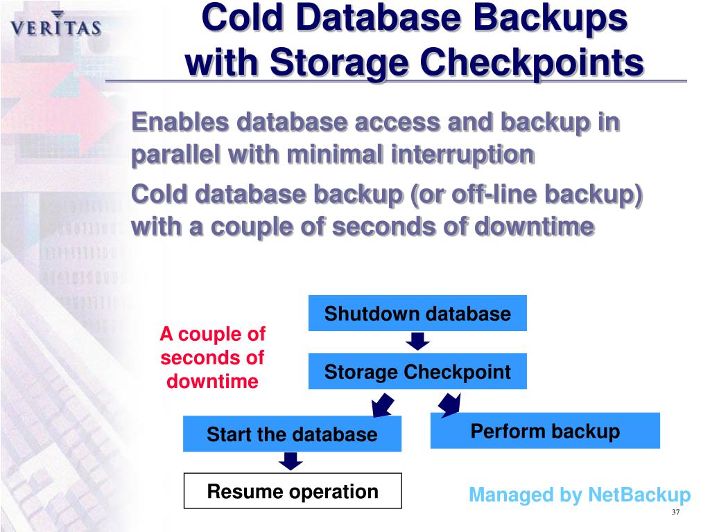 Cold Database Backupswith Storage Checkpoints • Enables database access and backup in parallel with minimal interruption • Cold database backup (or off-line backup) with a couple of seconds of downtime Shutdown database A couple of seconds of downtime Storage Checkpoint Perform backup Start the database Resume operation Managed by NetBackup