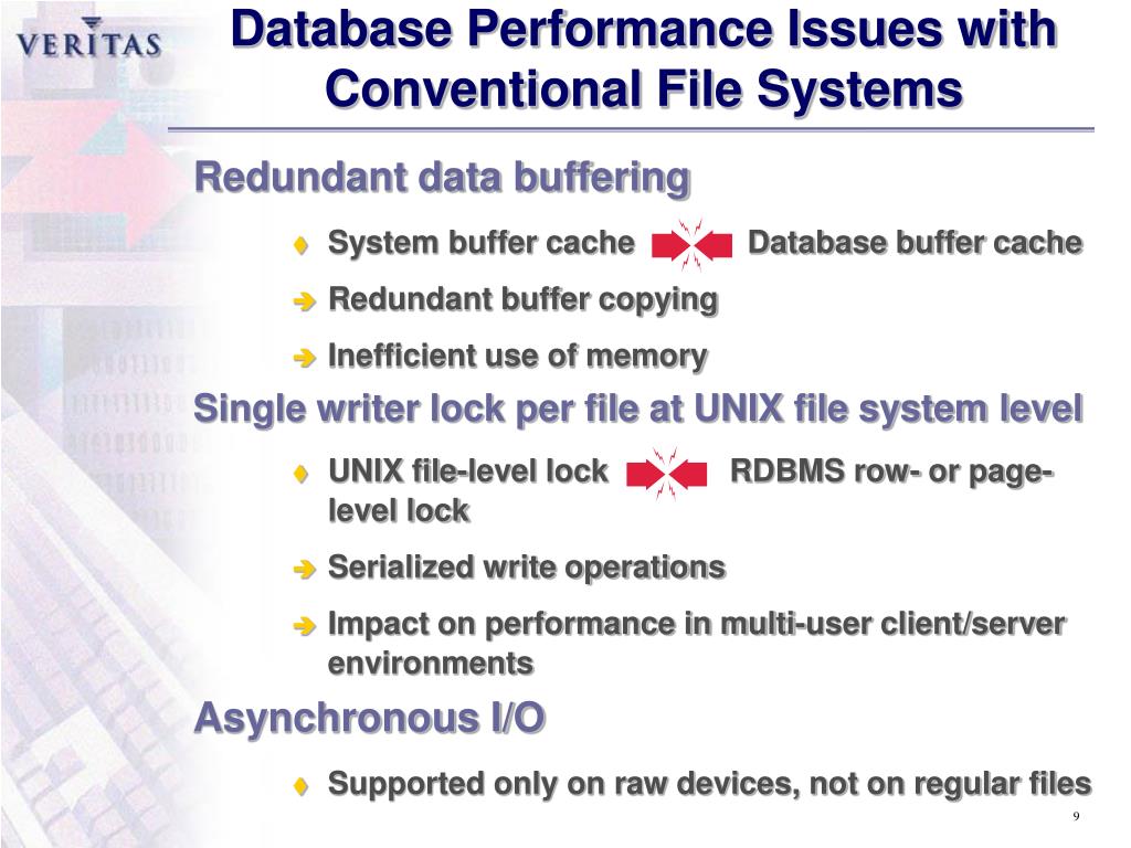 Database Performance Issues with Conventional File Systems • Redundant data buffering • System buffer cache Database buffer cache • Redundant buffer copying • Inefficient use of memory • Single writer lock per file at UNIX file system level • UNIX file-level lock RDBMS row- or page-level lock • Serialized write operations • Impact on performance in multi-user client/server environments • Asynchronous I/O • Supported only on raw devices, not on regular files