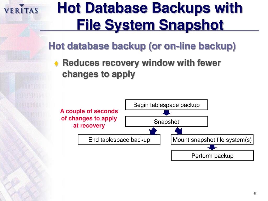 Begin tablespace backup A couple of seconds of changes to apply at recovery Snapshot End tablespace backup Mount snapshot file system(s) Perform backup Hot Database Backups withFile System Snapshot • Hot database backup (or on-line backup) • Reduces recovery window with fewer changes to apply