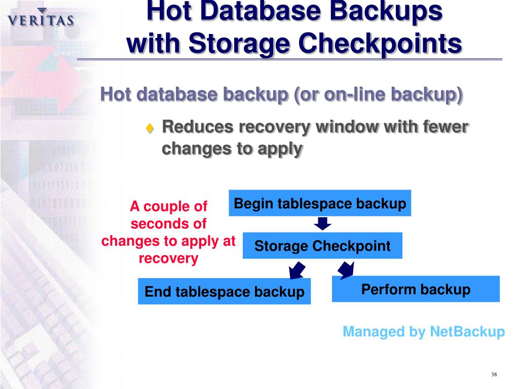 Hot Database Backupswith Storage Checkpoints • Hot database backup (or on-line backup) • Reduces recovery window with fewer changes to apply Begin tablespace backup A couple of seconds of changes to apply at recovery Storage Checkpoint Perform backup End tablespace backup Managed by NetBackup