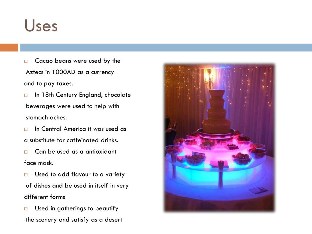 Uses • Cacao beans were used by the Aztecs in 1000AD as a currency and to pay taxes. • In 18th Century England, chocolate beverages were used to help with stomach aches. • In Central America it was used as a substitute for caffeinated drinks. • Can be used as a antioxidant face mask. • Used to add flavour to a variety of dishes and be used in itself in very different forms • Used in gatherings to beautify the scenery and satisfy as a desert