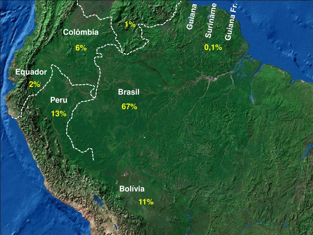 Guiana Suriname Guiana Fr. 1% Colômbia 0,1% 6% Equador 2% Brasil Peru 67% 13% Bolívia 11%