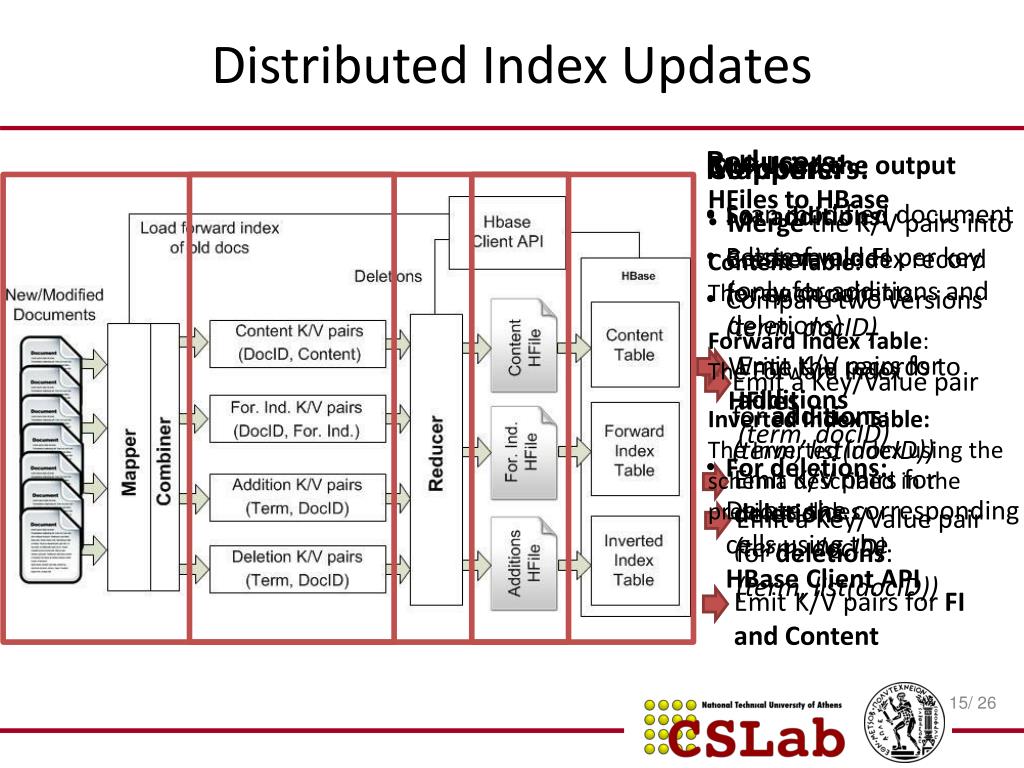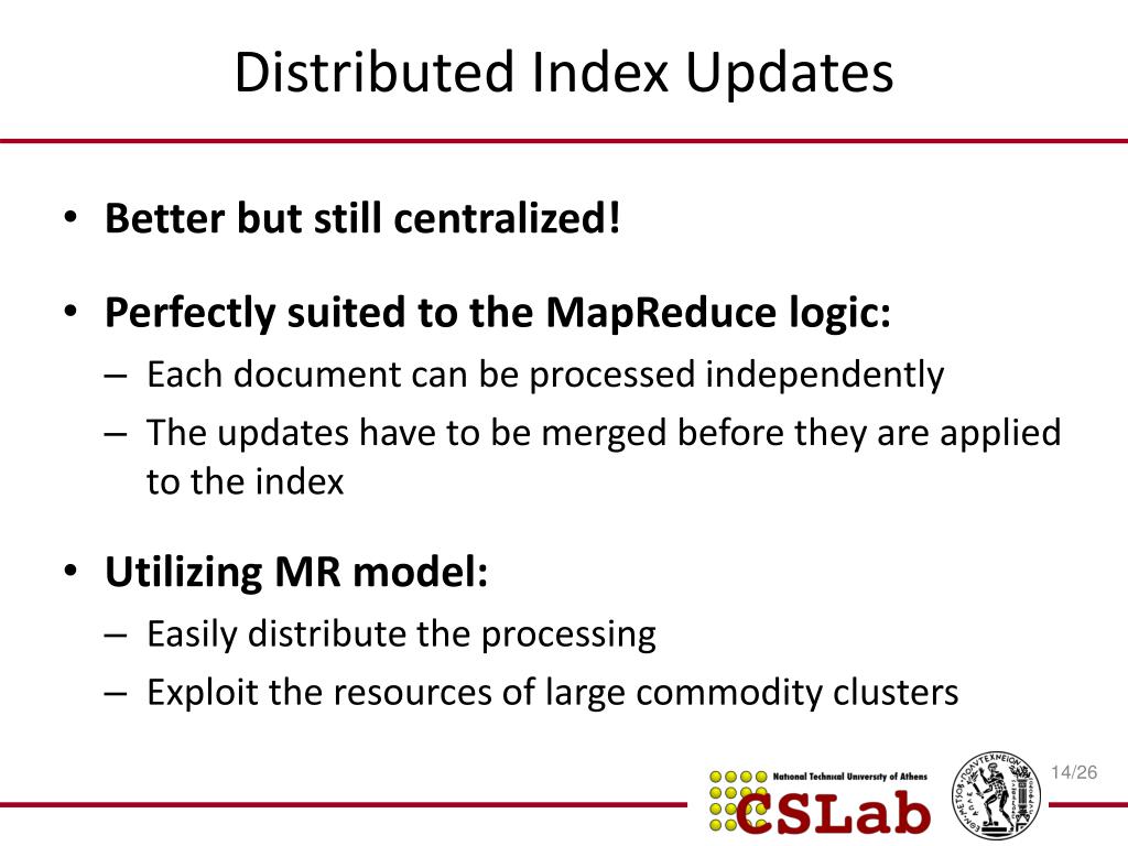 Distributed Index Updates • Better but still centralized! • Perfectly suited to the MapReduce logic: • Each document can be processed independently • The updates have to be merged before they are applied to the index • Utilizing MR model: • Easily distribute the processing • Exploit the resources of large commodity clusters