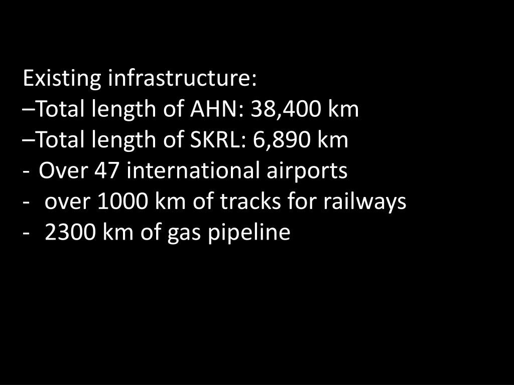 Existing infrastructure: • –Total length of AHN: 38,400 km • –Total length of SKRL: 6,890 km • Over 47 international airports • over 1000 km of tracks for railways • 2300 km of gas pipeline