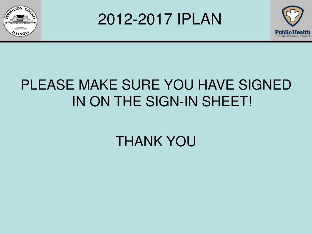 Vermilion County IPLAN 2012 - 2017. Community Needs Assessment. 2012-2017 IPLAN . PLEASE MAKE SURE YOU HAVE SIGNED IN ON THE SIGN-IN SHEET! THANK YOU . IPLAN 2012-2017.