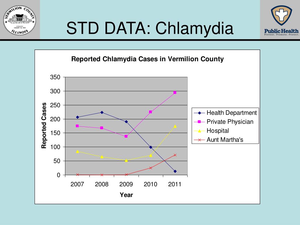 STD TRENDS:Chlamydia con’t • In 2010, Vermilion County was #10 in top 10 highest counties for Chlamydia. (Jackson, Peoria, Alexander, St. Clair, Pope, Macon, Pulaski, Champaign, Sangamon were 1-9 respectively)