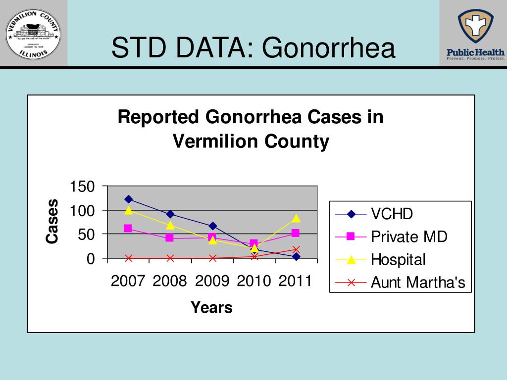 STD TRENDS:Gonorrhea • Gonorrhea rates are at historically low levels in the U.S. Cases increased slightly from 2009 to 2010 (300,000 cases in 2010 in U.S.) In the last 10 years (2000-2010) the Gonorrhea rate decreased from 128.7/100,000 to 100.8/100,000. per CDC 2010 STD Surveillance • CDC surveillance systems indicate that Gonorrhea may become resistant to the only available treatment option. • In the U.S., African Americans are most affected by Gonorrhea. (Black rate 512.2; Hispanic rate 63.2; White rate 26.0 (per 100,000) • Gonorrhea in Illinois(per IDPH STD section report 1/30/2012) (*Note: Illinois reporting is “cases” vs CDC “rates” above) • 61.0% of all positive cases were in ages 10-29; with highest prevalence in age group 15-19 yr old, 10.6% • is highest in prevalence in Black population, 8.9%; followed by Other 2.3%, then White 2.2%. • is prevalent in Non-Hispanic population 6.9%; Hispanic 2.3% • More males, 7.8% have Gonorrhea than females, 4.3% • Vermilion County ranked 15th in top counties with STD’s in 2010.