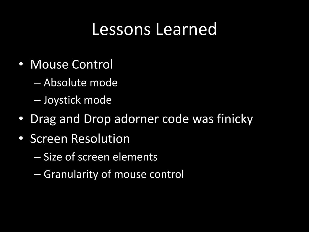 Lessons Learned • Mouse Control • Absolute mode • Joystick mode • Drag and Drop adorner code was finicky • Screen Resolution • Size of screen elements • Granularity of mouse control