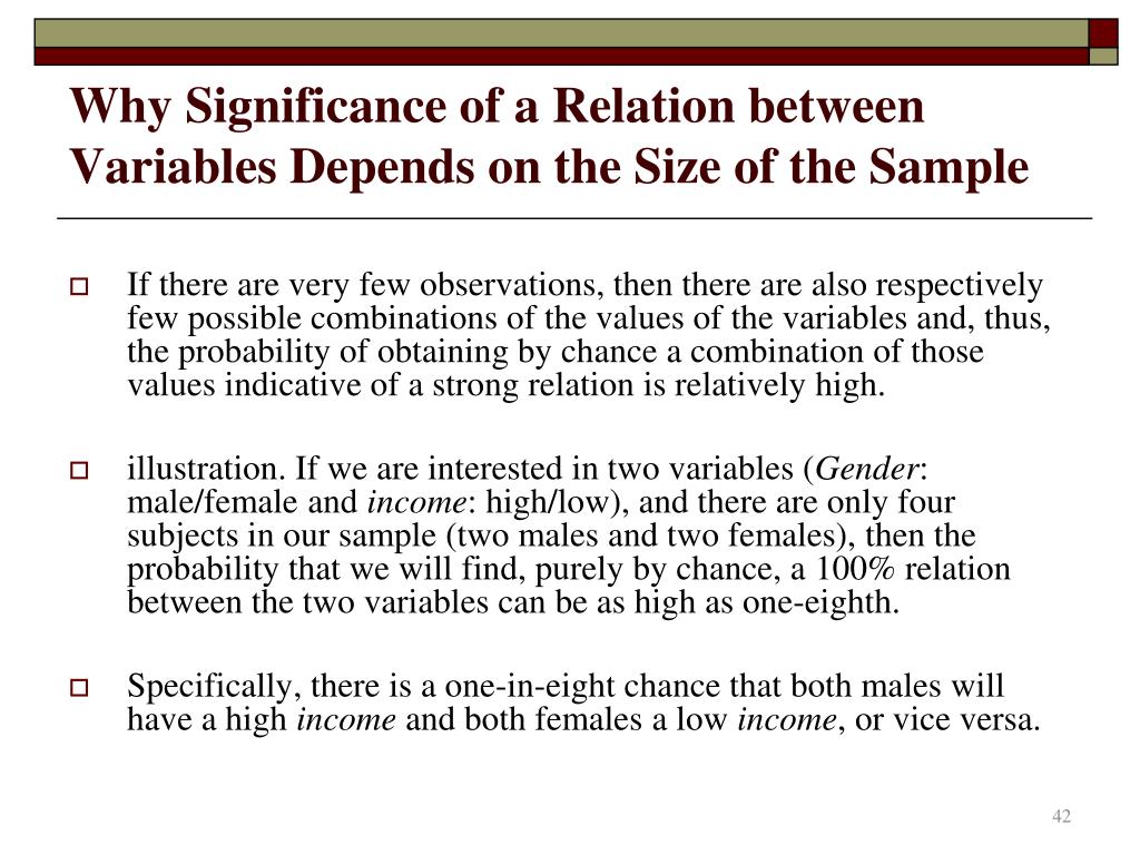 Why Significance of a Relation between Variables Depends on the Size of the Sample If there are very few observations, then there are also respectively few possible combinations of the values of the variables and, thus, the probability of obtaining by chance a combination of those values indicative of a strong relation is relatively high. illustration. If we are interested in two variables (Gender: male/female and income: high/low), and there are only four subjects in our sample (two males and two females), then the probability that we will find, purely by chance, a 100% relation between the two variables can be as high as one-eighth. Specifically, there is a one-in-eight chance that both males will have a high income and both females a low income, or vice versa.