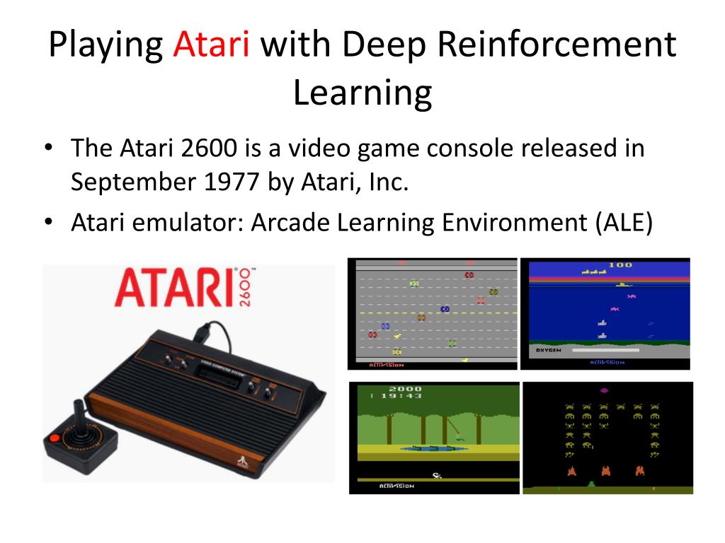Playing Atari with Deep Reinforcement Learning • The Atari 2600 is a video game console released in September 1977 by Atari, Inc. • Atari emulator: Arcade Learning Environment (ALE)