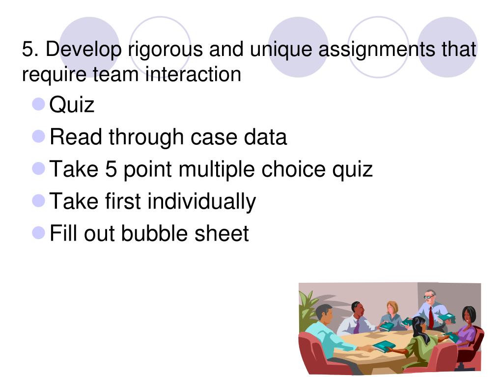 5. Develop rigorous and unique assignments that require team interaction • Quiz • Read through case data • Take 5 point multiple choice quiz • Take first individually • Fill out bubble sheet